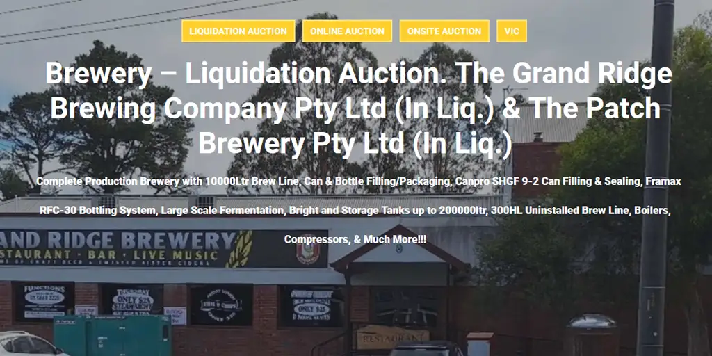 Hymans is holding an online only auction on behalf of Mackay Goodwin and Various Financiers to clear all assets formerly of The Grand Ridge Brewing Company Pty Ltd and The Patch Brewery Pty Ltd (In Liquidation). The business has various locations and contains a brewing line, various storage tanks and vessels, packaging equipment and shipping containers.