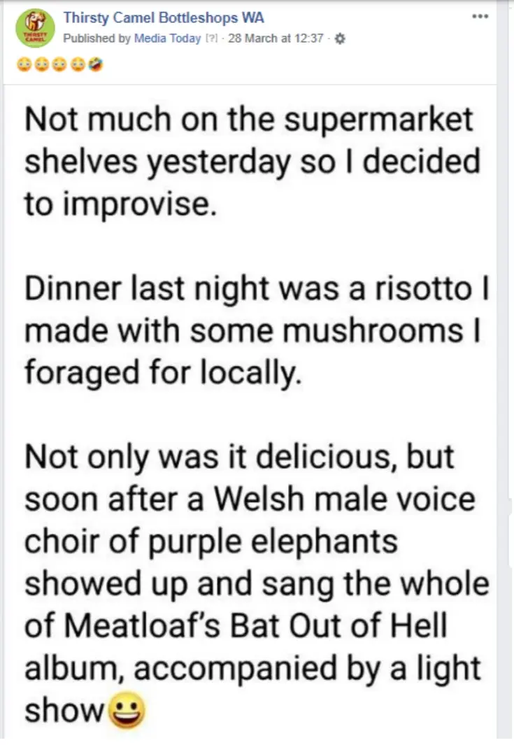 In the second, a complainant criticised a Thirsty Camel’s Facebook post (right) saying it was “insensitive and irresponsible for a liquor retailer to reference the consumption of an illegal hallucinogen when we are facing a global public health crisis and our health system is under enormous pressure.” ABAC dismissed the complaint.