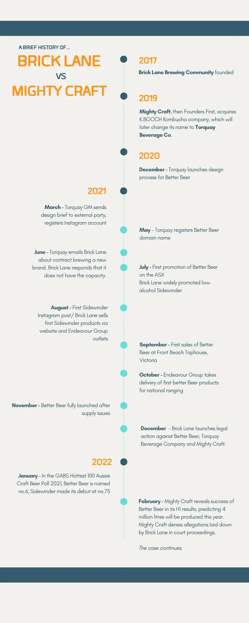 *timeline of events according to the respective claimant and respondent companies in their filings to the Federal Court of Australia’s NSW Registry. Dates have not been independently verified by Brews News.