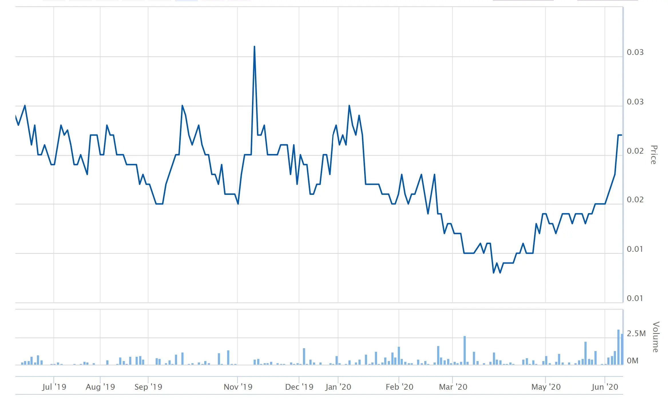 ASX graph showing the share price and volume of shares traded by Broo over the past year.