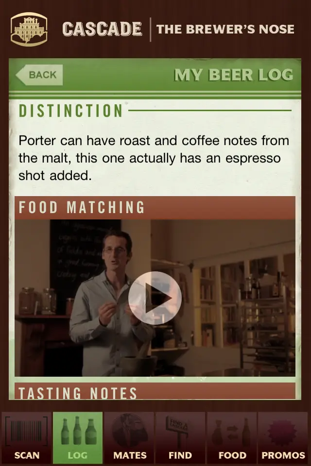 While obviously designed to market the CUB-owned Cascade Brewery, the application contains a database of more than 500 individual beers and is presented as a resource for beer drinkers to use when they are standing in their local bottleshop confronted by a wall of beers they may know little or nothing about. Using their compatible iPhone camera users can scan a beer’s barcode and get information about the beer including a description and ‘distinction’ for the beer. They can watch short videos of the Cascade brewers describing the scanned beer’s style and Tasmanian chef Rodney Dunn discuss some food matching options.