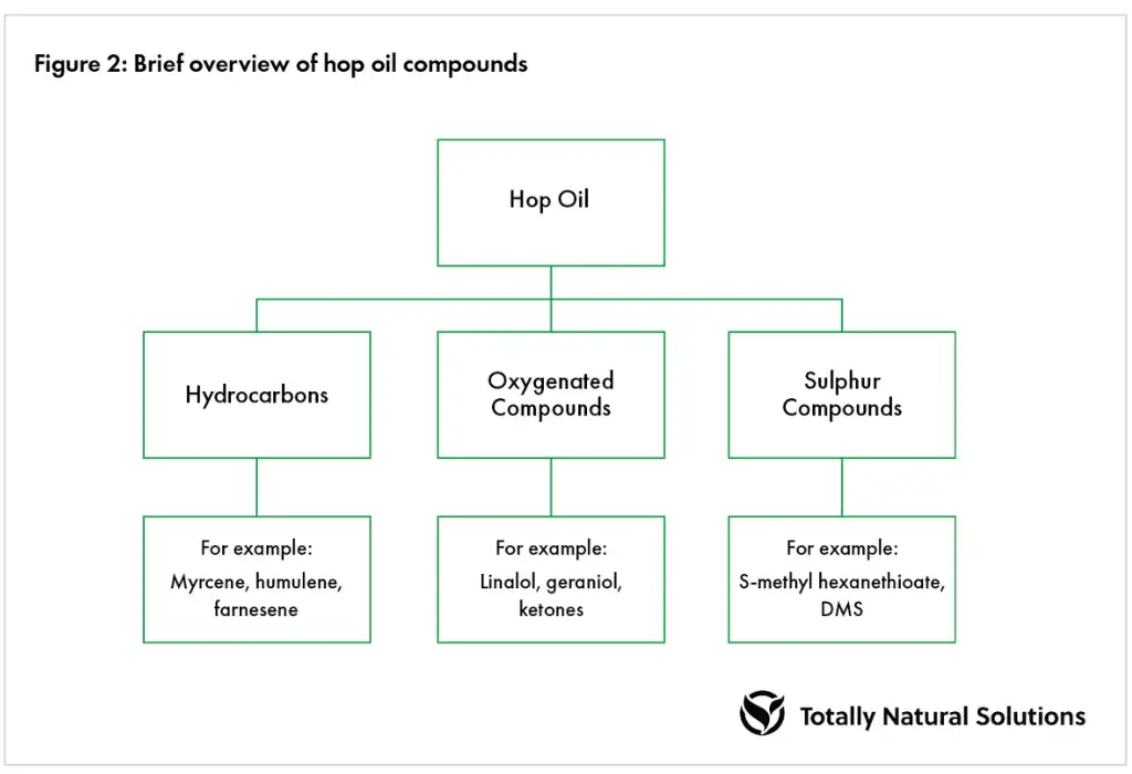 Delving deeper into the volatile oils present, there are specific compounds contributing towards aroma and flavour. We have divided these into 3 main groups: hydrocarbons, oxygenated compounds and sulphur compounds. For example, myrcene is a hydrocarbon commonly found in beer and can be easily identified as a green grassy note.