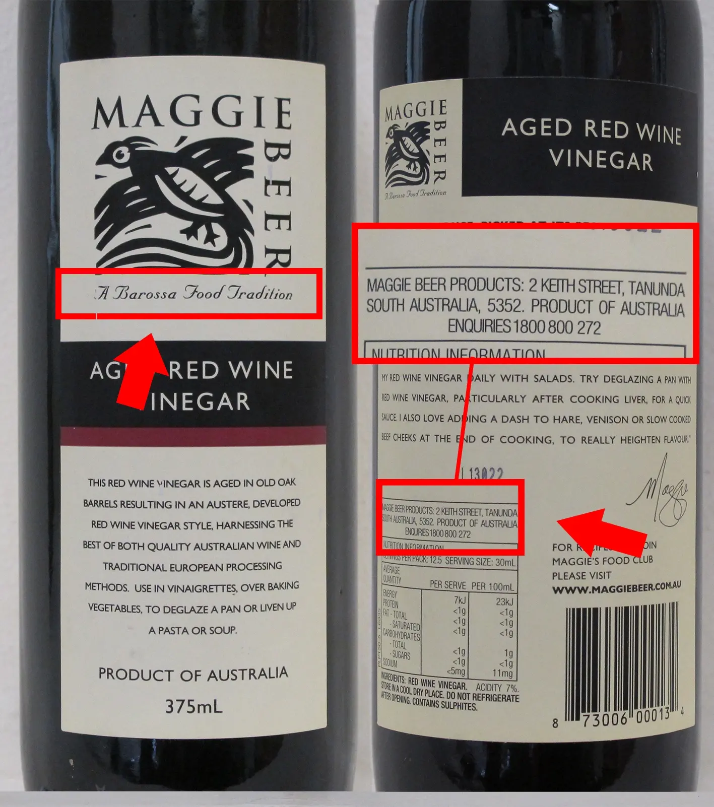 In that case the “Maggie Beer” logo which included the words “Maggie Beer A Barossa Food Tradition” on the label. The label also contained the words “Made in Australia” or “Product of Australia” and the business address, “Maggie Beer Products: 2 Keith Street Tanunda South Australia 5352”.