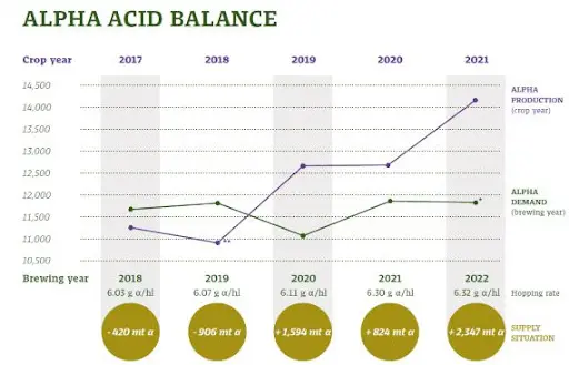 Of course, an excess of alpha does not translate to lower hop prices across the board. For instance, there was spot demand for Cascade, Willamette, Mt. Hood, Crystal and Liberty last year—none of them hops you think about when somebody says “high demand” —because the supply was already tight and yields were a bit light. As reported last month, growers have reacted to shifting demand by adjusting acreage.