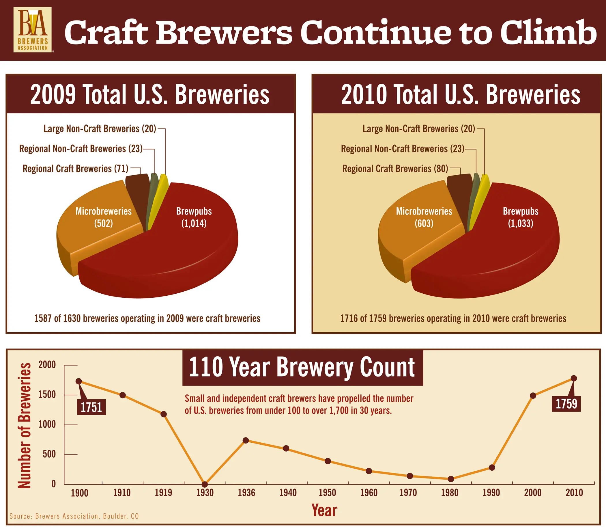 The Association also reported an eight per cent growth in the number of U.S. breweries. In 2010, there were 1,759 operating breweries. Craft brewers produced 9,951,956 barrels (1 164 378 852 litres), up from an adjusted 8,934,446 barrels (1 045 330 182 litres) in 2009.