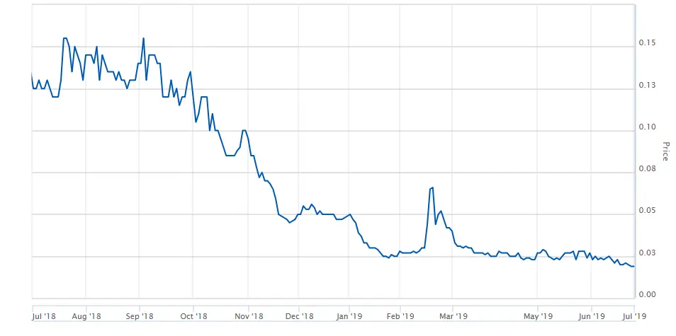Over the past 52 weeks, Broo’s share price has seesawed in a downward trend, from $0.16 at its height in July 2018 and again in September 2018, to lows of $0.02 over the past two months.